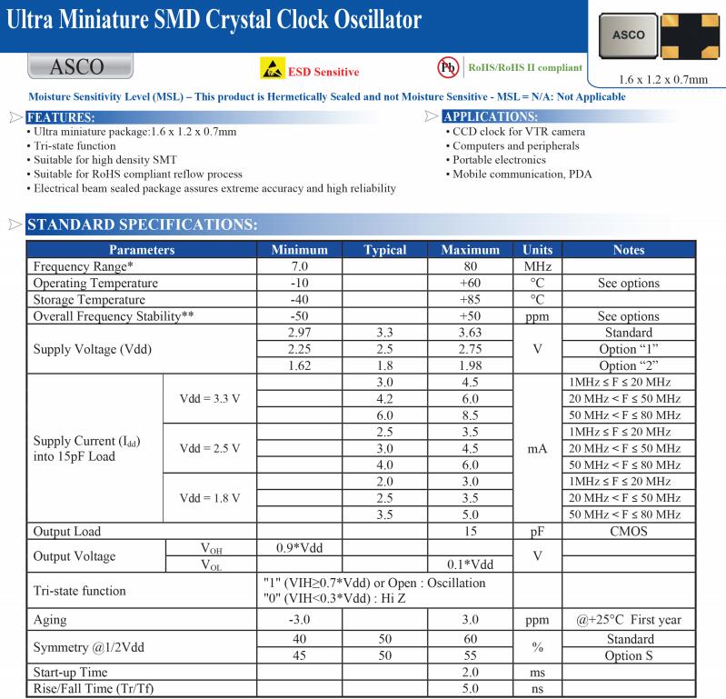 | ABRACON晶振 | 標示 | ASCO系列晶振 | 晶振基本信息對照表 |
