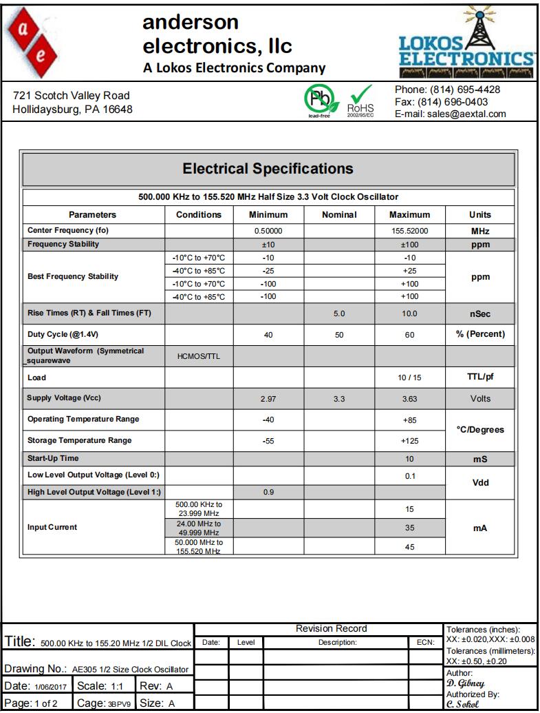 Anderson晶振|AE305正方形鐘振|125MHz規(guī)格表