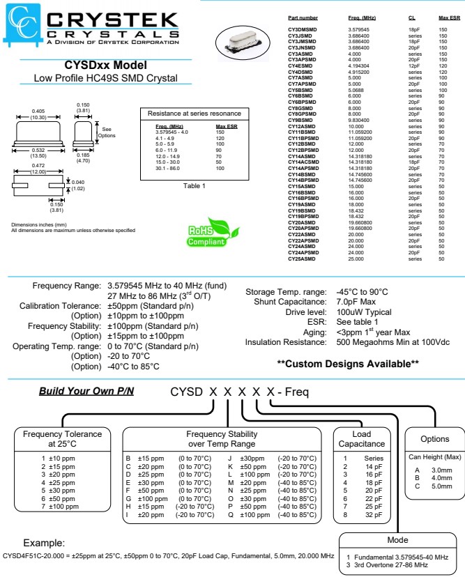 Frequency Range: 3.579545 MHz to 40 MHz (fund) 27 MHz to 86 MHz (3rd O/T) |