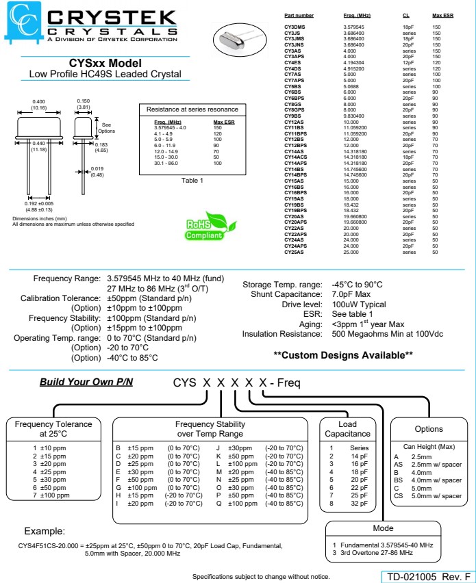 Frequency Range: 3.579545 MHz to 40 MHz (fund) 27 MHz to 86 MHz (3rd O/T) |