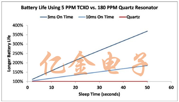 基于MEMS的SiT1552 TCXO晶振在溫度范圍內頻率變化小于5ppm,是一個很大的問題比石英晶體更準確的替代品.這種精確度減少了開啟時間并允許系統(tǒng)保持睡眠模式.使用SiT1552晶振,系統(tǒng)設計人員可以利用壓縮和傳輸數據僅在需要時短暫爆發(fā),同時保持設備處于最低功耗睡眠狀態(tài)以進行延長周期并可能達到電池續(xù)航時間的兩倍.圖7顯示增加與180ppm 32.768kHz石英晶體相比,使用5ppm 32.768KHz TCXO可獲得電池壽命諧振器.