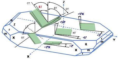 根據不同的應用領域以及不同環境下產品的工作溫度要求,因此創造了多種多樣不同的石英晶振切割角度方式.比如AT-,BT-CT-DT-NT-GT-等多種不同的切割板片.不同的切割方向的板片具有不同的彈性常數張量,不用的壓電常數張量以及不同的介電常數張量.而這些張量在石英晶振,石英元件的設計以及應用上展現了不同的振蕩以及溫度特性(如下圖所示),表現了在Z-plat石英結構上,幾種不同方向的石英板片切割方式. 石英晶振的振動模態