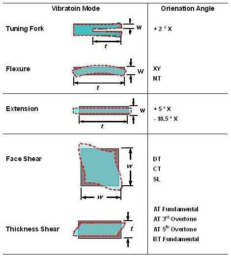 經由不同的石英切割角度以及不同電極形狀的電場效應,石英晶振晶片展現了各種不同的振動模式,以經常產生的振動莫態可以簡單分為擾曲模態,伸縮模態,面剪切模態和厚度剪切模態,而可能有多種模態同時存在在一個石英晶振晶片的振蕩中,經由適當的設計,可以壓制其他不希望產生的振動模態,來達到主要振動模態的最佳化.