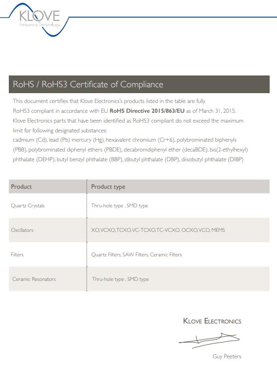 該表格證明列出的Klove Electronics產品完全符合歐盟RoHS指令2015/863/EU的要求(限制在電氣和電子設備中使用某些有害物質- RoHS3)。