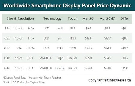 ④ 由于需求下滑及新項目出現推遲情況,預估4月a-Si/LTPS智能機面板價格下降約$0.1~$0.2 美金,AMOLED智能機面板價格下降$0.5~$1.0 美金.