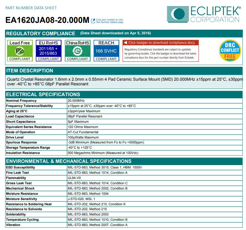 日蝕晶振,EA1620JA08-20.000M晶振,2016mm晶振本身體積小,超薄型石英晶體諧振器,特別適用于有目前高速發展的高端電子數碼產品,因為晶振本身小型化需求的市場領域,小型?薄型是對應陶瓷諧振器(偏差大)和普通的石英晶體諧振器(偏差小)的中間領域的一種性價比較出色的產品.產品廣泛用于筆記本電腦,無線電話,衛星導航HDD, SSD, USB, Blu-ray等用途,符合無鉛焊接的高溫回流焊曲線特性.