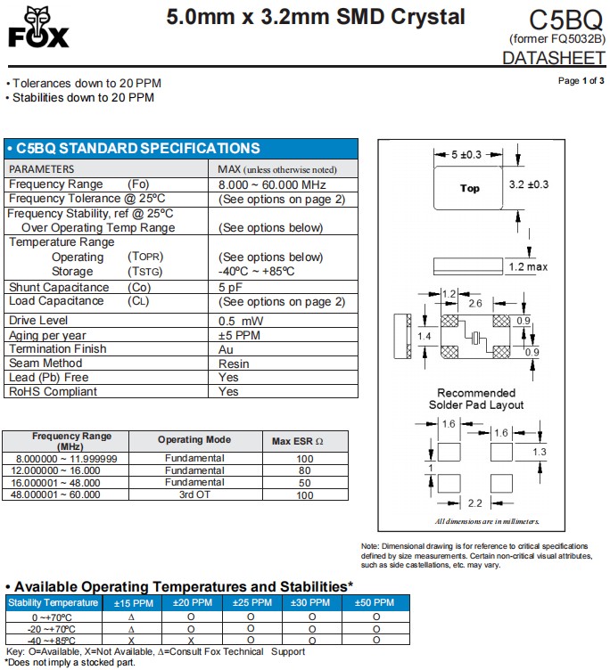 | FC5BQCCMC20.0-T1 | Fox 晶振 | C5BQ | 20 MHz | ±30ppm | ±30ppm | 20pF | 0°C ~ 70°C |