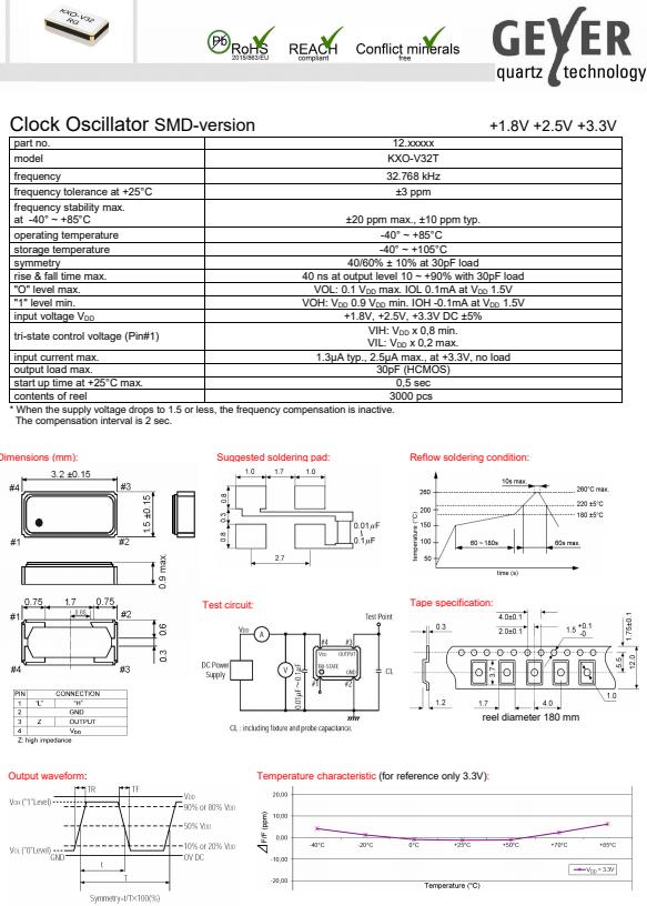 GEYER晶振,KXO-V32T時(shí)鐘振蕩器,3215mm有源晶振,小體積SMD時(shí)鐘振蕩器,是貼片音叉晶體,千赫頻率元件,應(yīng)用于時(shí)鐘模塊,智能手機(jī),全球定位系統(tǒng),因產(chǎn)品本身體積小,SMD編帶型,可應(yīng)用于高性能自動(dòng)貼片焊接,被廣泛應(yīng)用到各種小巧的便攜式消費(fèi)電子數(shù)碼時(shí)間產(chǎn)品,環(huán)保性能符合ROHS/無(wú)鉛標(biāo)準(zhǔn).
