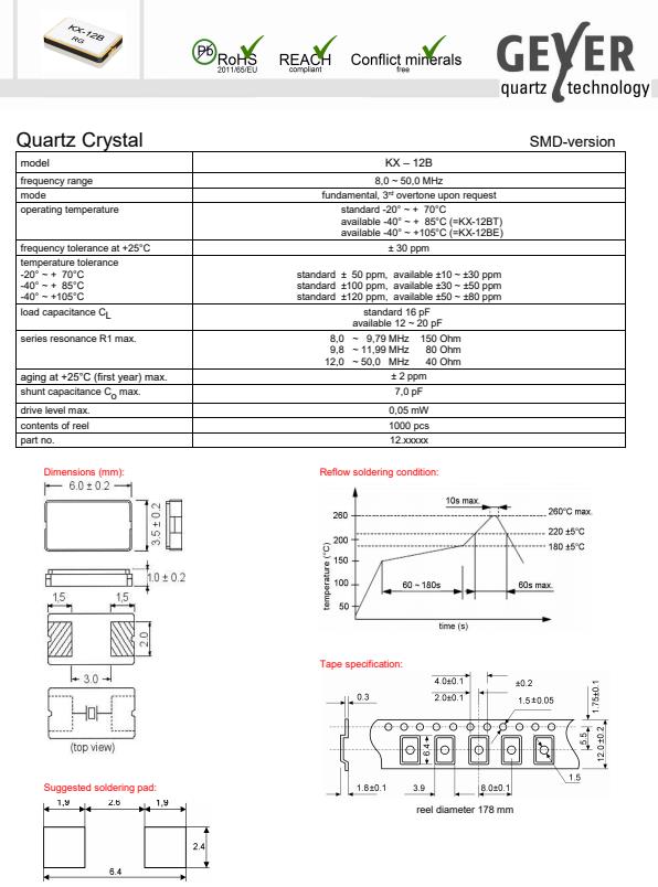 格耶德國晶振,KX-12B無源諧振器,6035mm兩腳晶振,貼片晶振本身體積小,超薄型石英晶體振蕩器,特別適用于有目前高速發展的高端電子數碼產品,因為貼片晶振本身小型化需求的市場領域,小型,薄型是對應陶瓷振蕩器(偏差大)和普通的石英晶體振蕩器(偏差小)的中間領域的一種性價比較出色的產品.產品廣泛用于筆記本電腦,無線電話,衛星導航SSD,USB,Blu-ray等用途,符合無鉛焊接的高溫回流焊曲線特性.