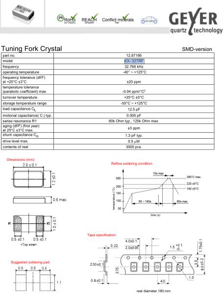 德國格耶晶振,KX-327RF貼片晶振,12.87166晶振,貼片表晶32.768KHZ晶振系列具有超小型,薄型,質地輕的表面貼片音叉型石英晶體振蕩器,晶振產品本身具備優良的耐熱性,耐環境特性,在辦公自動化,家電領域,移動通信領域可發揮優良的電氣特性,符合無鉛標準,滿足無鉛焊接的回流溫度曲線要求,金屬外殼的石英晶振使得產品在封裝時能發揮比陶瓷晶振外殼更好的耐沖擊性能.