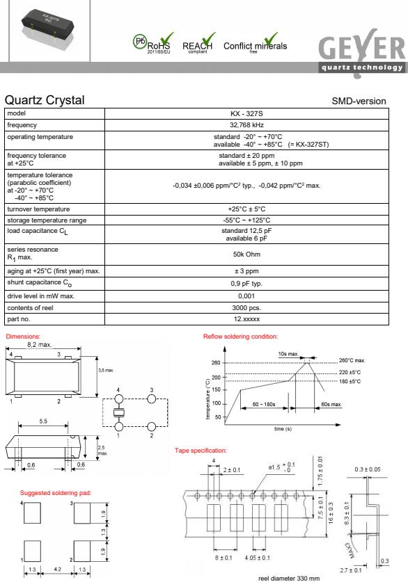 GEYER格耶晶振,KX-327S無(wú)源晶體,8038mm貼片晶振,32.768KHZ晶振時(shí)鐘晶體具有小型,薄型,輕型的貼片晶振表面音叉型晶體振蕩器,產(chǎn)品具有優(yōu)良的耐熱性,耐環(huán)境特性,可發(fā)揮晶振優(yōu)良的電氣特性,符合RoHS規(guī)定,滿足無(wú)鉛焊接的高溫回流溫度曲線要求,金屬外殼的封裝使得產(chǎn)品在封裝時(shí)能發(fā)揮比陶瓷振蕩器外殼更好的耐沖擊性.