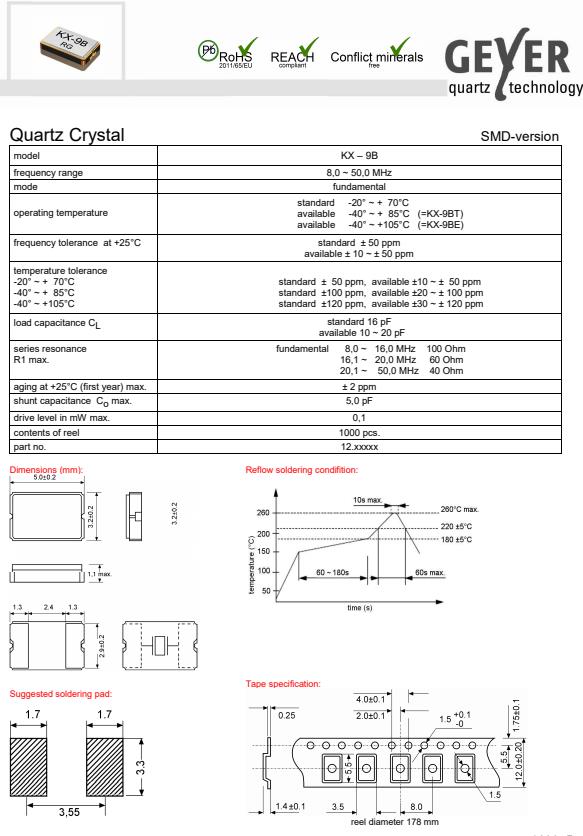 GEYER歐美晶振,KX-9B兩腳晶振,低損耗晶振,小型表面貼片晶振型,是標準的石英晶體振蕩器,適用于寬溫范圍的電子數碼產品,家電電器及MP3,MP4,播放器,單片機等領域.可對應8.000MHz以上的頻率,在電子數碼產品,以及家電相關電器領域里面發揮優良的電氣特性,滿足無鉛焊接的回流溫度曲線要求.