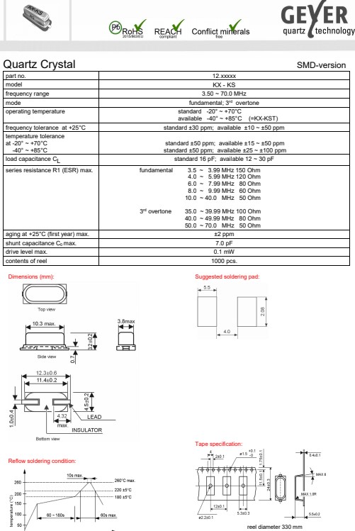 GEYER晶振,KX-KS低損耗晶振,無源貼片晶振,普通貼片石英晶振外觀使用金屬材料封裝的,具有高穩定性,高可靠性的石英晶體振蕩器,晶振外觀本身使用金屬封裝,充分的密封性能,可確保其高可靠性,采用編帶包裝,外包裝采用朔膠盤,可在自動貼片機上對應自動貼裝等優勢.