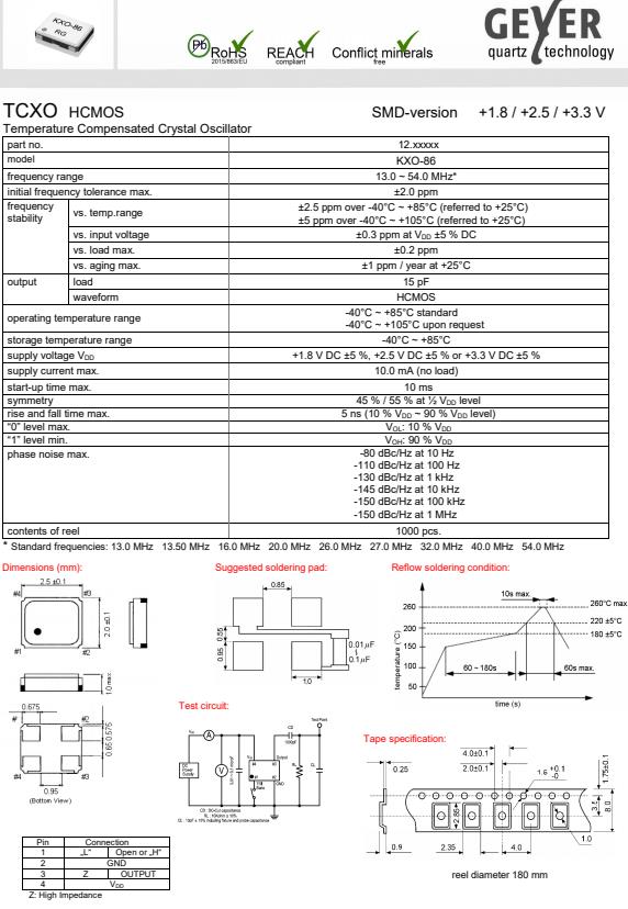 GEYER晶振,KXO-86溫補晶振,2520mm貼片晶振,有源晶振,是指晶體本身起振需要外部電壓供應,起振后可直接驅動CMOS集成電路,產品本身已實現與薄型IC(TSSOP封裝,TVSOP封裝)同樣的1mm厚度,斷開時的消費電流是15µA以下,編帶包裝方式可對應自動搭載及IR回流焊接(無鉛對應)產品有幾種電壓供選1.8V,2.5V,3V3.3V,5V,以應對不同IC產品需要