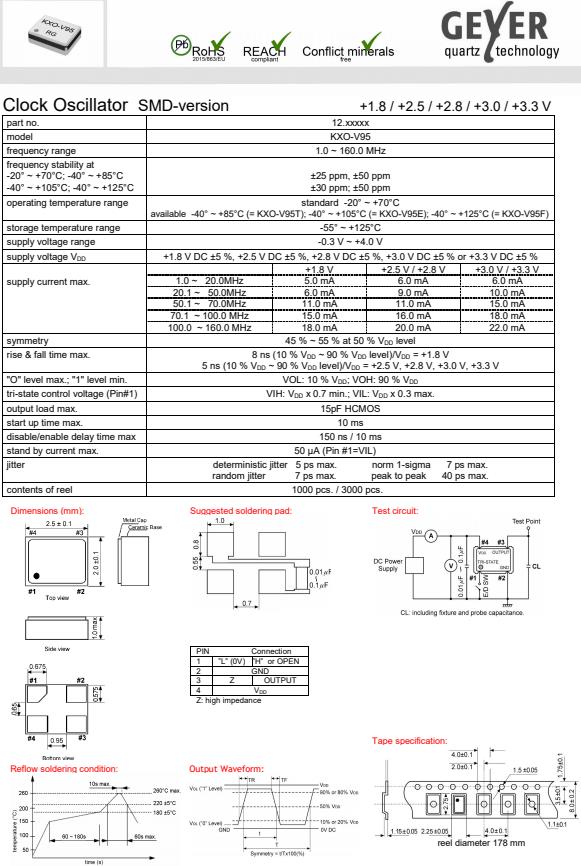 GEYER晶振,KXO-V95有源貼片晶振,低電壓晶振,有源晶振,是指晶體本身起振需要外部電壓供應,起振后可直接驅動CMOS集成電路,產品本身已實現與薄型IC(TSSOP封裝,TVSOP封裝)同樣的1mm厚度,斷開時的消費電流是15µA以下,編帶包裝方式可對應自動搭載及IR回流焊接(無鉛對應)產品有幾種電壓供選1.8V,2.5V,3V3.3V,5V,以應對不同IC產品需要.