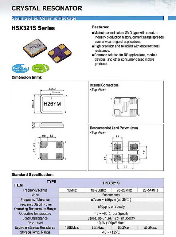 加高晶振,HSX321S晶振,3225小體積晶振3225mm體積非常小的SMDcrystal器件,是民用小型無線數碼產品的最佳選擇,小體積的晶振被廣泛應用到,手機藍牙,GPS定位系統,無線通訊集,高精度和高頻率的穩定性能,非常好的減少電磁干擾的影響,是民用無線數碼產品最好的選擇,符合RoHS/無鉛.