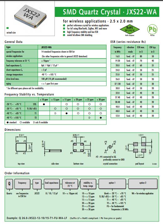 Q 20.0-JXS22-8-10/15-T1-FU-WA-LF|20MHz|8PF|2520|JAUCH,歐美進口晶振,4墊版本·2.5 x 2.0 mm n ± 10 ppm類型可用,EMI屏蔽可能通過接地蓋,回流焊溫度: 260°C max。陶瓷/金屬包裝。SMD石英晶體·JXS22