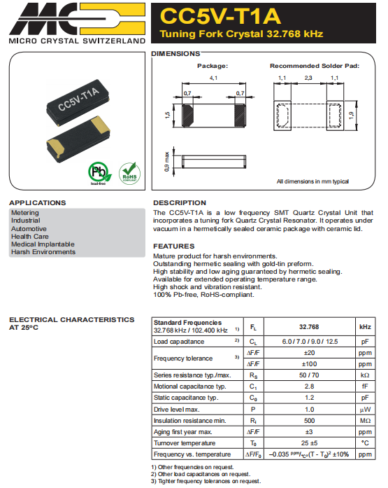 CC5V-T1A-32.768kHz-7pF-20PPM-TA-QC,4115mm,6G模塊晶振,歐美微晶晶振,型號CC5V-T1A,是一個低頻SMT石英晶體單元,包含一個音叉石英晶體諧振器,編碼CC5V-T1A-32.768kHz-7pF-20PPM-TA-QC,頻率32.768KHz,負載7pf,尺寸4115mm,工作溫度-40~85°C,適用于惡劣環境的成熟產品,具有高抗沖擊和抗振動性,6G模塊晶振,工業應用晶振,測試與測量設備晶振,汽車電子設備晶振.