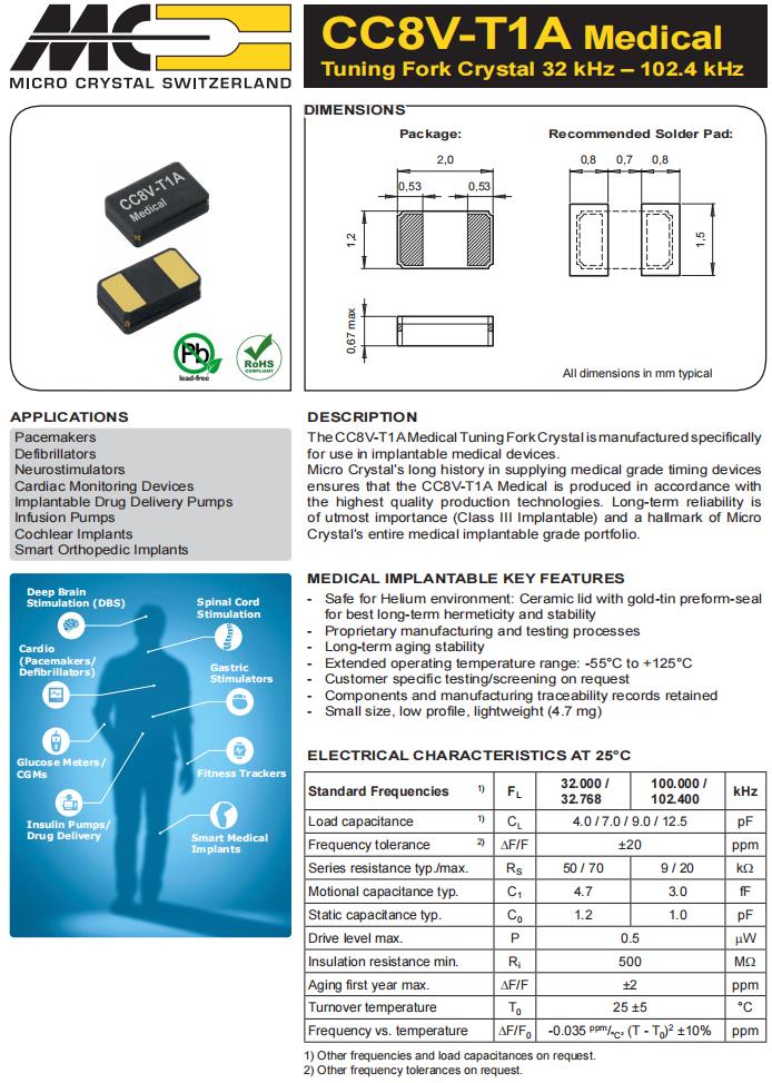 CC8V-T1A-32.768kHz-12.5pF-20ppm-TB-QM,2012mm音叉晶體,醫(yī)療設(shè)備專(zhuān)用晶振,CC8V-T1A醫(yī)用音叉晶體,無(wú)源晶振,編碼CC8V-T1A-32.768kHz-12.5pF-20ppm-TB-QM,是專(zhuān)門(mén)為植入式醫(yī)療設(shè)備制造的,Micro Crystal在提供醫(yī)療級(jí)計(jì)時(shí)設(shè)備方面的悠久歷史確保了CC8V-T1A醫(yī)療按照最高質(zhì)量的生產(chǎn)技術(shù)生產(chǎn),頻率32.768KHz,尺寸2012mm音叉,負(fù)載12.5pF,是醫(yī)療設(shè)備專(zhuān)用晶振,可用于心臟起搏器,去纖顫器,耳蝸植入設(shè)備等產(chǎn)品.