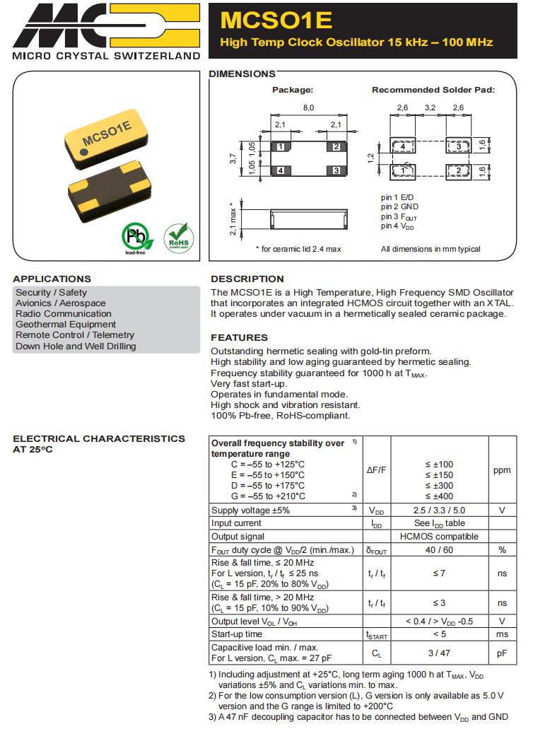 MCSO1ECHV-C-40.000MHz-E/D-T3|耐高溫晶振|6G基站晶振,Micro晶振,MCSO1E石英晶體振蕩器,MCSO1ECHV-C-40.000MHz-E/D-T3晶振,8037mm晶振,貼片石英晶振,頻率40MHz,電壓3.3V,頻率穩定性100ppm,工作溫度-55~125°C,耐高溫晶振,高抗沖擊晶振,抗振動晶振,6G基站晶振,安全設備晶振,無線電通信晶振,地熱設備晶振,遙測設備晶振,井下和鉆井設備晶振.