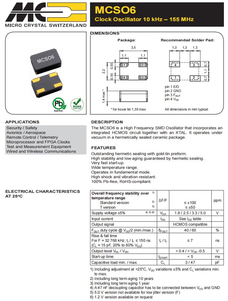 MCSO6FKVT–C-40.000MHz-E/D,6G無線網絡晶振,3522mm貼片晶振,瑞士微晶晶振,MCSO6有源晶振,MCSO6FKVT–C-40.000MHz-E/D晶振,3522mm貼片晶振,石英晶體振蕩器,頻率40MHz,電壓3.3V,頻率穩定性50ppm,工作溫度-55~125°C,耐高溫晶振,抗沖擊晶振,6G無線網絡晶振,航空電子晶振,遠程控制應用晶振,測試和測量設備晶振,微處理器晶振.