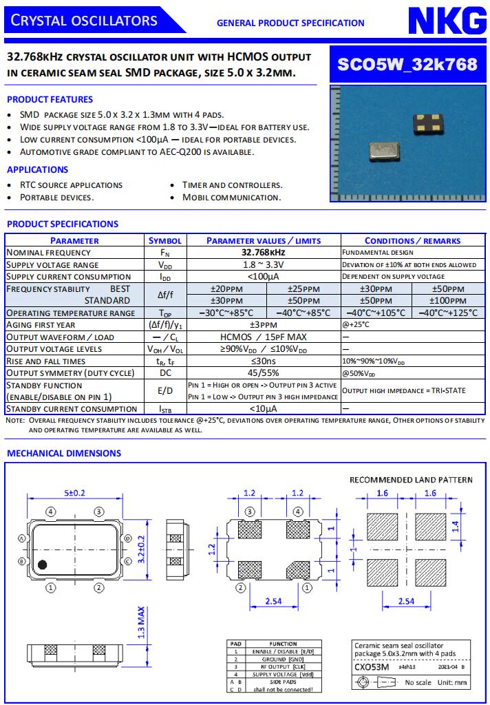 NKG晶振|SCO5W-B-32K768-ZTS-EXT|5032有源晶振特點