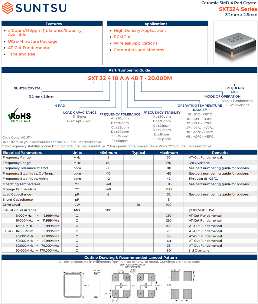 | SXT32410AA07-48.000M | 3.2X2.5 SMD (4 PAD) CRYSTAL | 10pF | ±50ppm | 48.000M |
