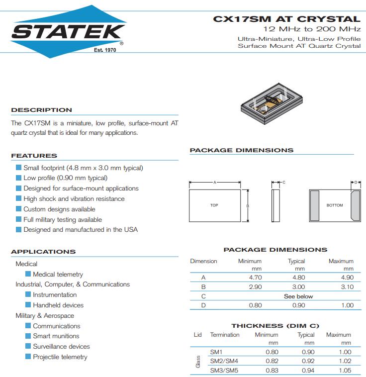 美國STATEK晶振,CX17SM晶振,二腳晶體諧振器貼片晶振本身體積小,超薄型石英晶體諧振器,特別適用于有目前高速發(fā)展的高端電子數(shù)碼產(chǎn)品,因為晶振本身小型化需求的市場領(lǐng)域,小型?薄型是對應(yīng)陶瓷諧振器(偏差大)和普通的石英晶體諧振器(偏差小)的中間領(lǐng)域的一種性價比較出色的產(chǎn)品.產(chǎn)品廣泛用于筆記本電腦,無線電話,衛(wèi)星導航HDD, SSD, USB, Blu-ray等用途,符合無鉛焊接的高溫回流焊曲線特性.