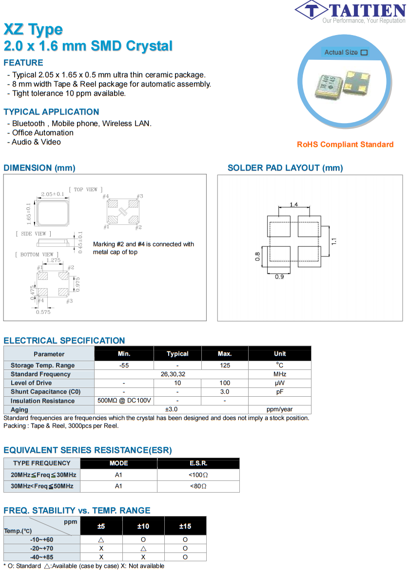 XZDPPLNANF-32.000000|32MHz|15PPM|12PF|-40~85℃|TAITIEN,臺灣泰藝石英晶振,XZ型2.0 x 1.6 mm SMD晶體,典型的2.05 x 1.65 x 0.45 mm超薄陶瓷包裝。- 8 mm寬的膠帶和卷軸包裝,用于自動組裝。緊密公差10 ppm可用,藍牙,移動電話,無線局域網(wǎng)。辦公室自動化,音頻和視頻.
