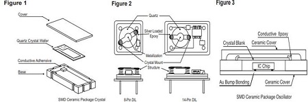 石英晶體單元包括一小條石英帶或一盤石英,根據用戶指定的諧振頻率,將其加工成確切的尺寸和厚度.石英鍍有導電電極,并安裝在密封的保護罩中(見圖1).電極通過玻璃對金屬的密封或通過SMD陶瓷封裝(見圖1)連接到穿過基座的引線.電極通過鍍層陶瓷連接到焊盤.晶體單元通常與其他電路封裝在一起,以實現功能齊全的模塊,例如石英晶體振蕩器或復數濾波器.圖2和圖3說明了簡單的晶體振蕩器.由于晶體單元的性質,正確處理非常重要. 機械沖擊