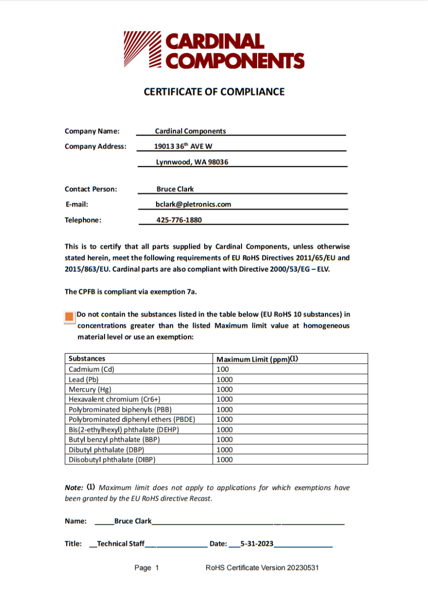 除非本協議另有說明,否則基本部件提供的所有部件均符合歐盟RoHS指令2011/65/EU和2015/863/EU的以下要求。基本部件也符合指令2000/53/EG-ELV。Cardinal晶振不含下表所列物質(EU RoHS 10物質)的濃度大于均質材料水平上所列的最大限值。