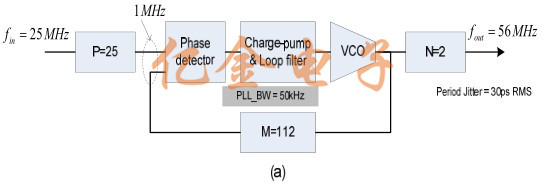 設計a需要較大的P值,從而產(chǎn)生一個帶寬為50kHz(由公式3計算)并且抖動為30ps,這超出了規(guī)范.設計b利用頻率程序-能夠選擇允許的輸入頻率預分頻比為1,產(chǎn)生PLL帶寬為1.4MHz.抖動小于10ps rms,符合規(guī)定的要求.