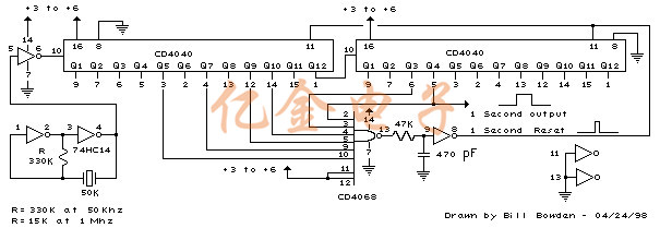 使用50Khz晶振時,當加起來50000的相應計數器位全部為高時,檢測到50000的計數.這對應于位15(32768)+14(16384)+9(512)+8(256)+6(64)+4(16).位14和15是第二計數器的第3和第4級,位0是第一計數器(Q1,引腳9)的第一級.要使用100Khz晶體,每個位將向右移動一次,因此總數將為(65536+32768+1024+512+128+32=100,000).使用1Mhz晶體,需要以下位: 在1Mhz時,有源晶體振蕩器電路中的330K電阻需要按比例減小到大約15K.當達到終端計數時,在NAND門之后的施密特觸發器反相器級產生7μS復位脈沖.47K電阻和470皮法電容維持輸出,使計數器可靠地復位為零.這在50Khz時不到一個時鐘周期,并且不會引入錯誤,但在1MHz時會達到7個周期,這將導致計數器每秒丟失7微秒的時間.這不是一個錯誤(百萬分之七),但它會存在.4040 CMOS計數器的最小復位脈沖寬度約為1.5uS,因此復位脈沖不能短得多.