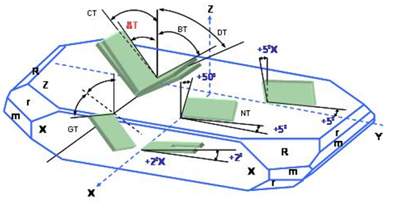 依據不同的應用領域及工作溫度需求, 因應了許多不同的石英切割角度種類. 例如AT-, BT-, CT-, DT-, NT, GT…..等不同的切割板片. 不同的切割方向的板片具有不同的彈性常數張量, 不同的壓電常數張量(piezoelectric constant tensor)及不同的介電常數張量(dielectric constant tensor). 這些張量在石英組件的設計及應用上展現了不同的振蕩及溫度特性. (如圖)表現了在Z-plat石英結構上,幾種不同方向的石英板片切割方式.