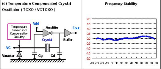 為了滿足應用面需求而言, 石英晶體振蕩器內部的振蕩線路有以基本波或三倍頻不同方式. 若要達到數佰兆赫的輸出頻率時, 振蕩線路后級可以采用鎖相回路方式或倍頻方式, 將較低頻率的石英振蕩頻率提升. 對于輸出端的輸出準位及輸出波形也有各類不同需求,如CMOS, LVPECL, LVDS…..等. 這些規(guī)格都要仔細的定義.在(如圖)提供了數種石英振蕩器輸出頻率對溫度變化的穩(wěn)定性示義圖.