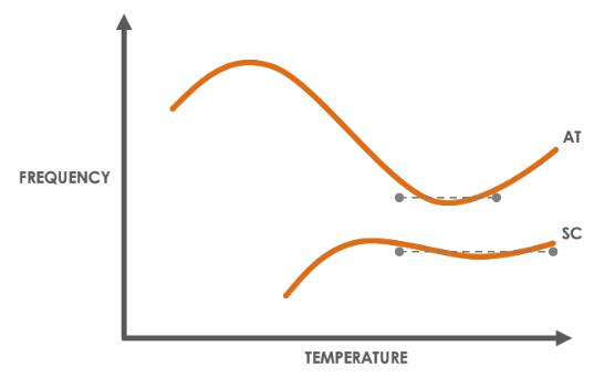 • 更高的工作溫度:SC 切割晶體的轉(zhuǎn)折點高于 AT 切割晶體,使其成為烘箱應(yīng)用的理想選擇。這種較高轉(zhuǎn)折點的缺點是在較低溫度下急劇下降。由于這一特性,SC 切割晶體僅適用于恒溫振蕩器,在其他振蕩器配置(TCXO、VCXO 等)中無法正常工作。