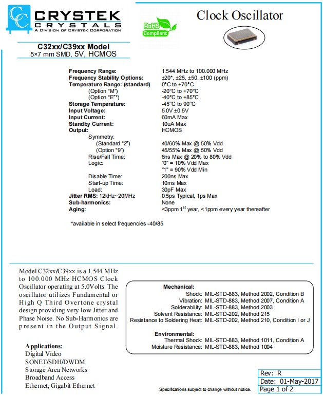 | C3290-44.736 | Crystek晶振 | C3290 | XO (Standard) | 44.736MHz | ±100ppm |