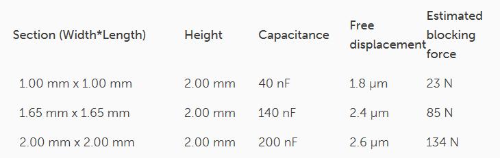 CTS 丹麥高級研發(fā)工程師 Charles Mangeot 先生表示:“由于高密度封裝導致致動機構(gòu)可用空間更小,業(yè)界正在推動更小的壓電致動器。但是小型化對電氣驅(qū)動和安全性造成了限制,因此低電壓操作通常是一個挑戰(zhàn)。我們過去曾生產(chǎn)過小型執(zhí)行器,但通過集中精力改進設(shè)計和工藝,CTS 現(xiàn)在能夠更有效地制造此類產(chǎn)品,并將其提供給廣泛的應(yīng)用和客戶。我們努力突破我們產(chǎn)品的界限,為壓電多層執(zhí)行器提供新的應(yīng)用。” 規(guī)格