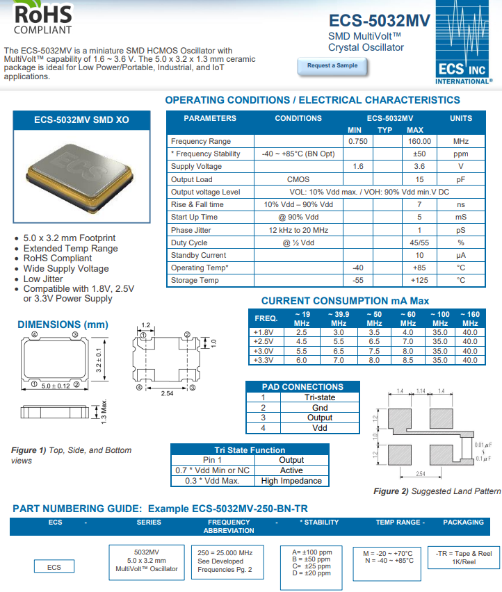 ECS晶振ECS-5032MV是一款微型SMD HCMOS石英晶體振蕩器,具有低功耗、固定頻率、低抖動和MultiVolt(1.6V至3.63V)功能。它們采用工業標準封裝,尺寸為5.0x3.2x1.3毫米(LWH)陶瓷封裝四腳貼片晶振。MultiVolt特性允許客戶將同一器件用于多種設計,從而降低認證要求并減少庫存。非常適合低功耗/便攜式、工業,物聯網,存儲設備,導航和無線設備等應用。ECS-5032MV-250-BN-TR非常適合導航和無線設備應用