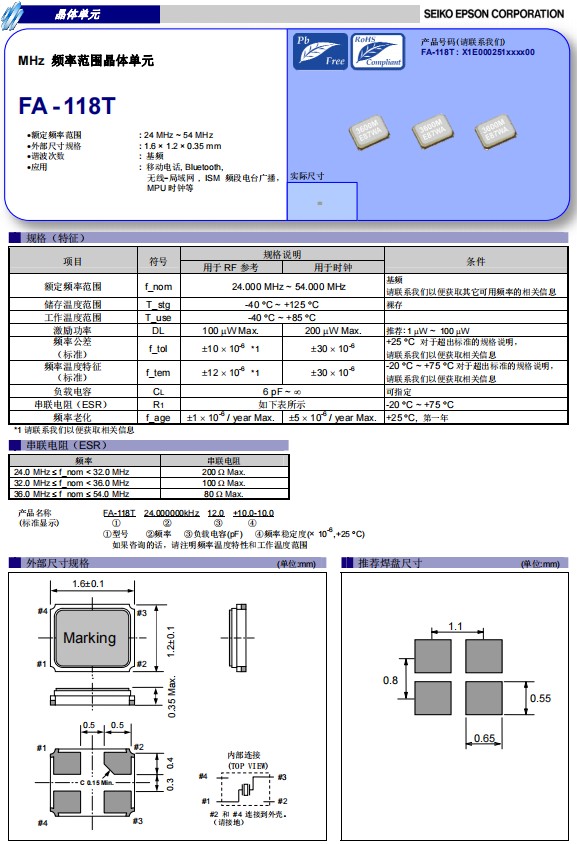 超小型1612mm無源晶振FA-118T適用于移動電話應用,X1E000251006400,石英晶體諧振器