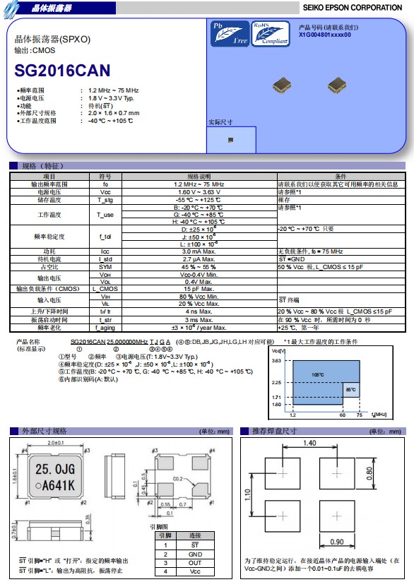 日本愛普生晶振SG2016CAN,是一款小體積晶振尺寸2.0x1.6mm石英晶體振蕩器(SPXO),支持CMOS輸出電平,四腳貼片晶振,有源晶振,1.8V至3.3V的寬工作電壓和寬工作溫度范圍從-40℃到+85℃(+105℃)。 SG2016CAN有源晶振還具有超低功耗的優(yōu)點。響應(yīng)時間僅為3ms,上升/下降延遲時間為4ns。在工作頻率為20MHz,無負(fù)載情況時,工作電流可達(dá)1.8mA,待機狀態(tài)下的電流可達(dá)2.7μA。所以,在5G前傳光模塊方案中,如果需要MCU主頻更穩(wěn)定,外置高溫、穩(wěn)定性好的5G晶振時,EPSON公司推出的SG2016CAN晶振是較理想的選擇。常用有源晶振型號SG2016CAN編碼X1G004801005800,頻率20.000MHz,工作溫度-40℃至85℃.具有超小型,輕薄型,低抖動,低功耗,低損耗,低耗能,低電流消耗等特點,非常適合5G模塊,物聯(lián)網(wǎng)、可穿戴設(shè)備、醫(yī)療設(shè)備、工業(yè)自動化等各種應(yīng)用。