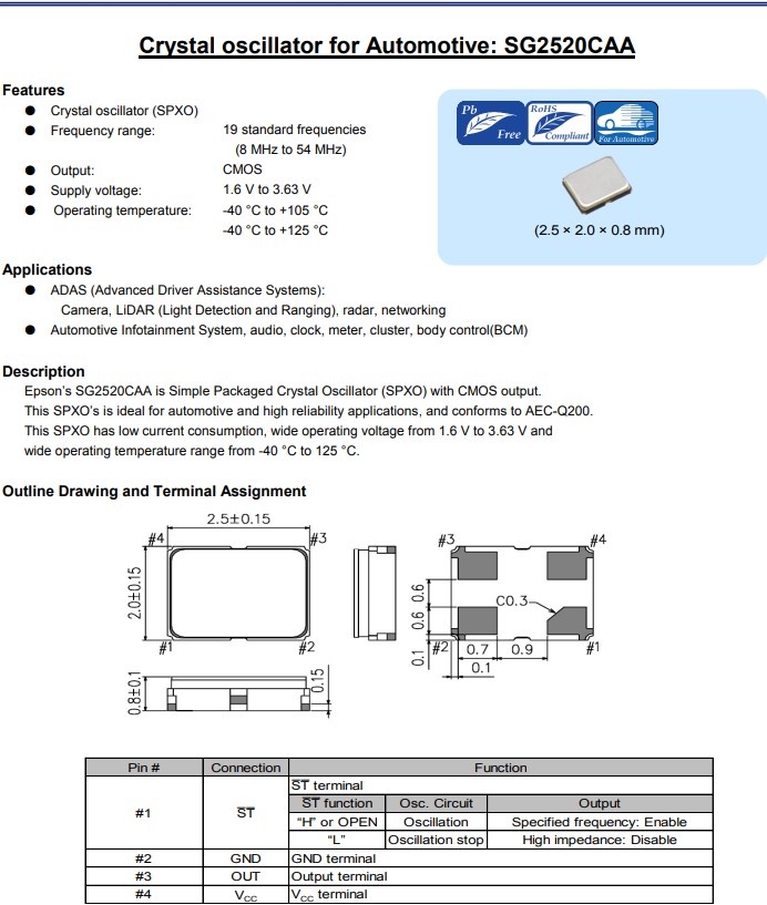 愛普生SG2520CAA具有高響應速度的2520封裝汽車級晶振,X1G005951001216,CMOS輸出晶體振蕩器|
