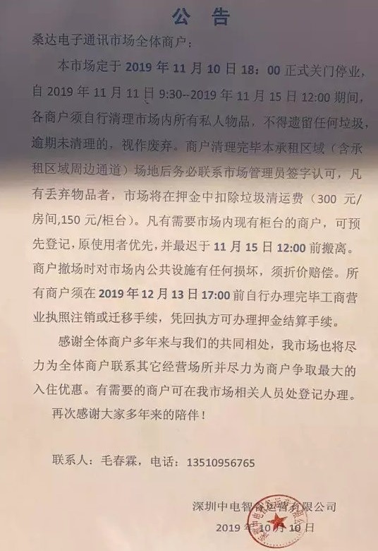如今,桑達電子通訊市場即將停業(yè),桑達電子通訊市場各個出入口均貼了《公告》,宣布將在11月10日正式停業(yè).該《公告》始發(fā)時間是2019年10月10日,一個月后,桑達電子通訊市場將正式停業(yè)清場.