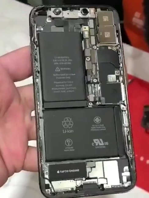 從上圖中我們可以很清楚的看到,內部元件整體布局和之前幾代iPhone很相似,但也有明顯的變化,最大的不同就是其擁有兩塊電池,電池一橫一豎呈L形排列,最大化的利用了機身內部空間,結構看起來相當緊湊.同時,PCB主板面積也小了很多,差不多只有iPhone 8 Plus的一半,內部配備了兩塊電池,蘋果是為OLED屏幕做足了準備.