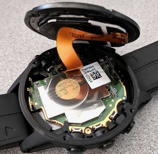 就是這樣:沒有觸摸屏(考慮到當手表在戶外活動環境中使用時,手指可能潮濕、寒冷、不干凈或戴有手套等等,而使觸摸屏不能良好地工作,不采用觸摸屏也就說得過去),也沒有原生語音控制.不可否認,與Apple Watch、Fitbit、Google Wear OS以及其他競爭對手相比,這樣的用戶界面有點“守舊”的感覺,但鑒于其目標市場,這個問題影響不大. 中間設有光電容積脈搏波光學心率傳感器,一側設有專有的四墊連接器,用于實現充電和數據傳輸.pcb驅動顯示屏是靠那根寬銅色排線實現.那根較窄的黑色排線用于將PCB連接到NFC天線.法拉第屏蔽罩上方的銅色圓盤是個簡單的揚聲器.伸出PCB一側的那三根(彈簧支承的)金屬桿提供與前表圈的連接,這個前表圈也用來充當GPS天線.而實現GPS定位功能靠的是貼片晶振,采用3225晶振,2520晶振封裝減少空間,實現高精密穩定性.
