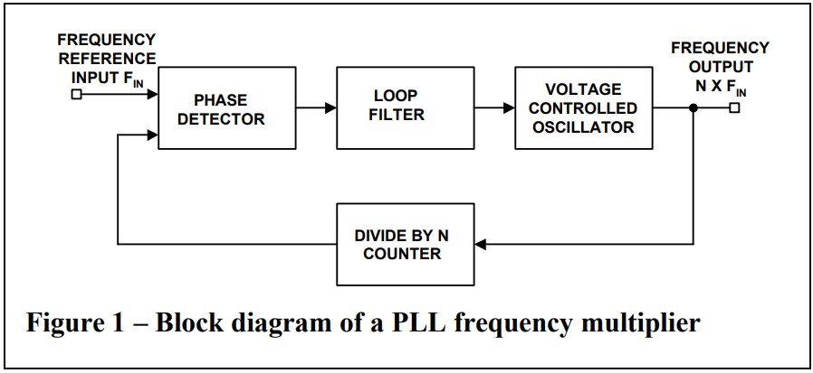圖1包含一個模塊基本PLL示意圖倍頻器。這該電路的操作是典型的全鎖相循環。這基本上是一種反饋控制系統控制電壓控制的相位貼片振蕩器(VCO)。輸入信號施加到一個輸入端相位檢測器。其他的輸入連接到N分頻的輸出 柜臺。通常情況下 兩個信號的頻率將 幾乎一樣。這鑒相器的輸出為 與電壓成比例的電壓 之間的相位差兩個輸入。這個信號是應用于環路濾波器。它是環路濾波器決定的動態特征 鎖相環。濾波后的信號控制VCO。注意到VCO的輸出為a N倍的頻率提供給的輸入頻率參考輸入。