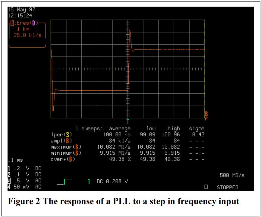 請注意,石英晶振的頻率 垂直軸PLL顯示a 50 %超調。這稍微欠阻尼響應為a 達成妥協 更快的壓擺率容差和 中等捕獲范圍。
