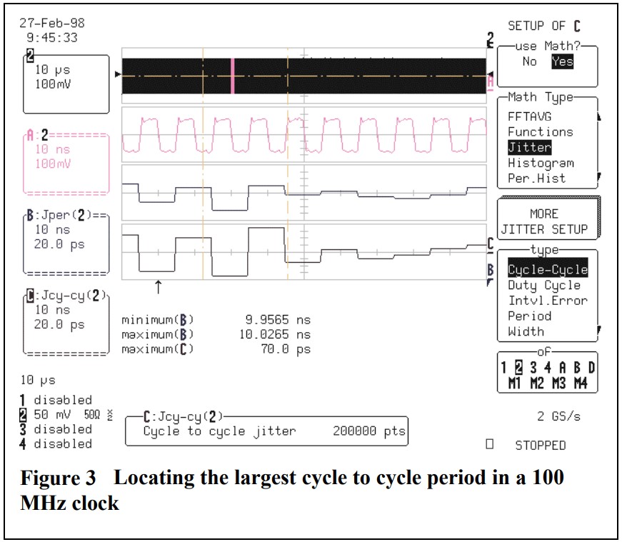 工程師可以 驗證系統時鐘通過以下方式滿足本規范 測量系統時鐘 使用抖動跟蹤循環來循環。 這如圖3所示。 在100 us記錄中最大循環周期 差70 ps。這個值 是直接從抖動跟蹤周期到周期 軌跡c中的波形。該區域 在垂直參數之間 光標標記最大值。 跡線A是 采集的數據并顯示 兩個相鄰的循環最大差異。 軌跡B是抖動軌跡讀取絕對值的周期 的每個周期的周期 時鐘波形。貼片石英晶振