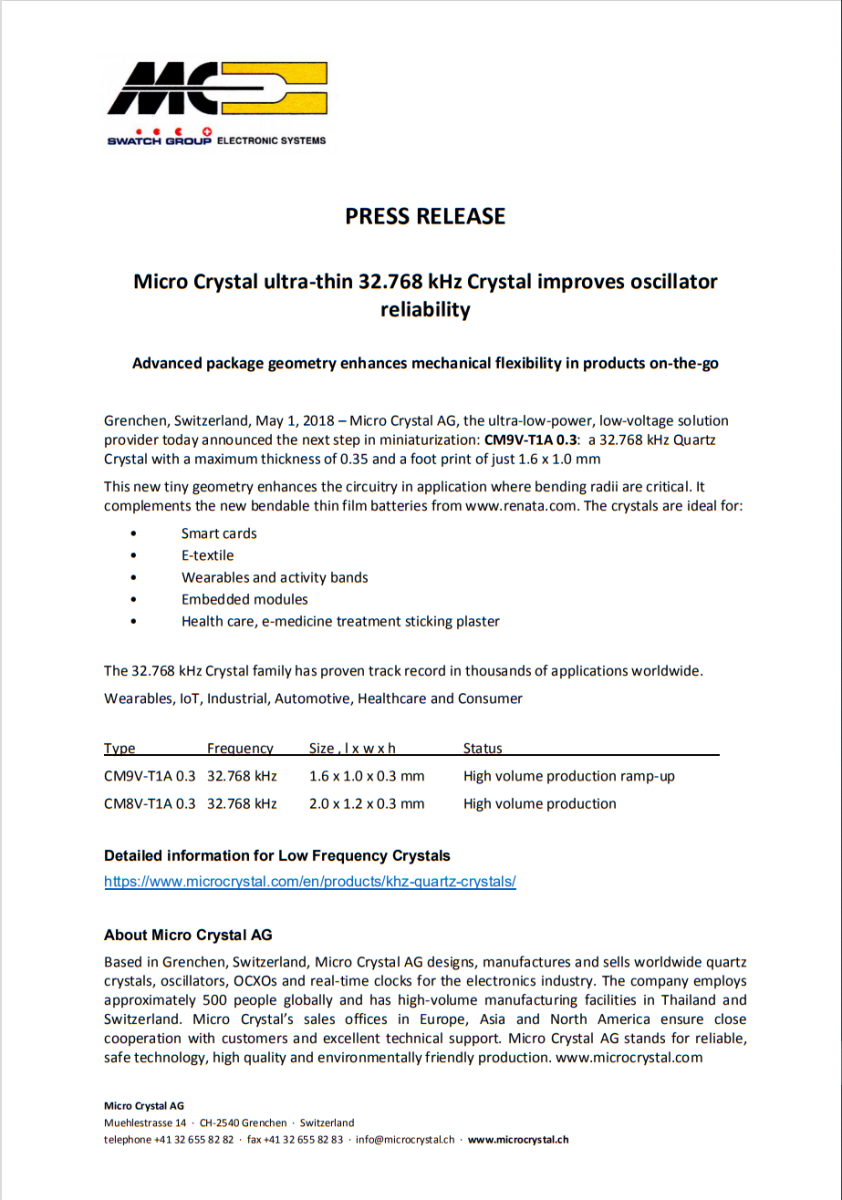 先進(jìn)的晶體幾何形狀可實現(xiàn)更小的封裝,瑞士格倫興,微晶晶振是世界領(lǐng)先的電子行業(yè)石英晶體、振蕩器、OCXO 和實時時鐘的領(lǐng)先供應(yīng)商,現(xiàn)在提供采用僅 1.2 * 2.0 * 0.7 mm 的先進(jìn)微型封裝的廣受歡迎的振蕩器。這種密封封裝將集成電路與XTAL一起承載。它可承受惡劣的環(huán)境條件。除了大電源電壓范圍外,它還具有非常低的功耗。在有源模式下,驅(qū)動一個CMOS負(fù)載時功耗低至0 μA。由于振蕩器也以待機(jī)模式(i= 45.1 μA)運行,因此可以瞬間獲得準(zhǔn)確的頻率,因此必須注意延遲啟動時間,例如典型的AT振蕩器。通過工廠校準(zhǔn),精度優(yōu)于使用外部XTAL的解決方案。 1.6 to 5.5 V 的寬電源電壓范圍與 -40°C to + 85°C 的大工作溫度范圍、低功耗和小封裝尺寸相結(jié)合,使其成為未來應(yīng)用的理想選擇