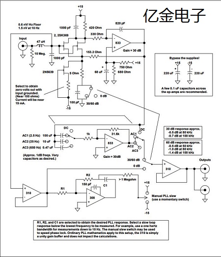 除了噪聲電壓,對放大器的要求沒有特別要求.由于鑒相器的輸出阻抗低,因此大多數放大器電路的輸入阻抗就足夠了.從幾赫茲到100kHz的頻率響應通常就足夠了,輸出負載通常是高阻抗頻譜分析儀和示波器.鑒相器輸出阻抗非常低,因此普通雙極晶體管的噪聲電流足夠低.例如,當源為典型的肖特基二極管混頻器時,普通的2N4403晶體管在10Hz時的噪聲電壓低于1納伏.幾種運算放大器的噪聲電壓低于3納伏,而少數運算放大器的噪聲電壓低于1納伏.由這些部件中的任何一個組成的簡單放大器在大多數應用中都將表現良好.大塊金屬電阻,繞線電阻和金屬膜電阻器幾乎沒有多余的噪聲,應代替碳膜或碳組成類型使用.應避免使用大多數電位計,因為薄膜和金屬陶瓷類型的噪聲很大.